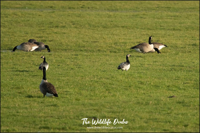 In the field at the rear of the Snipe Platform was a big flock of grazing Canada Geese. Unknown to me at the time there were two Barnacle Geese in with them.